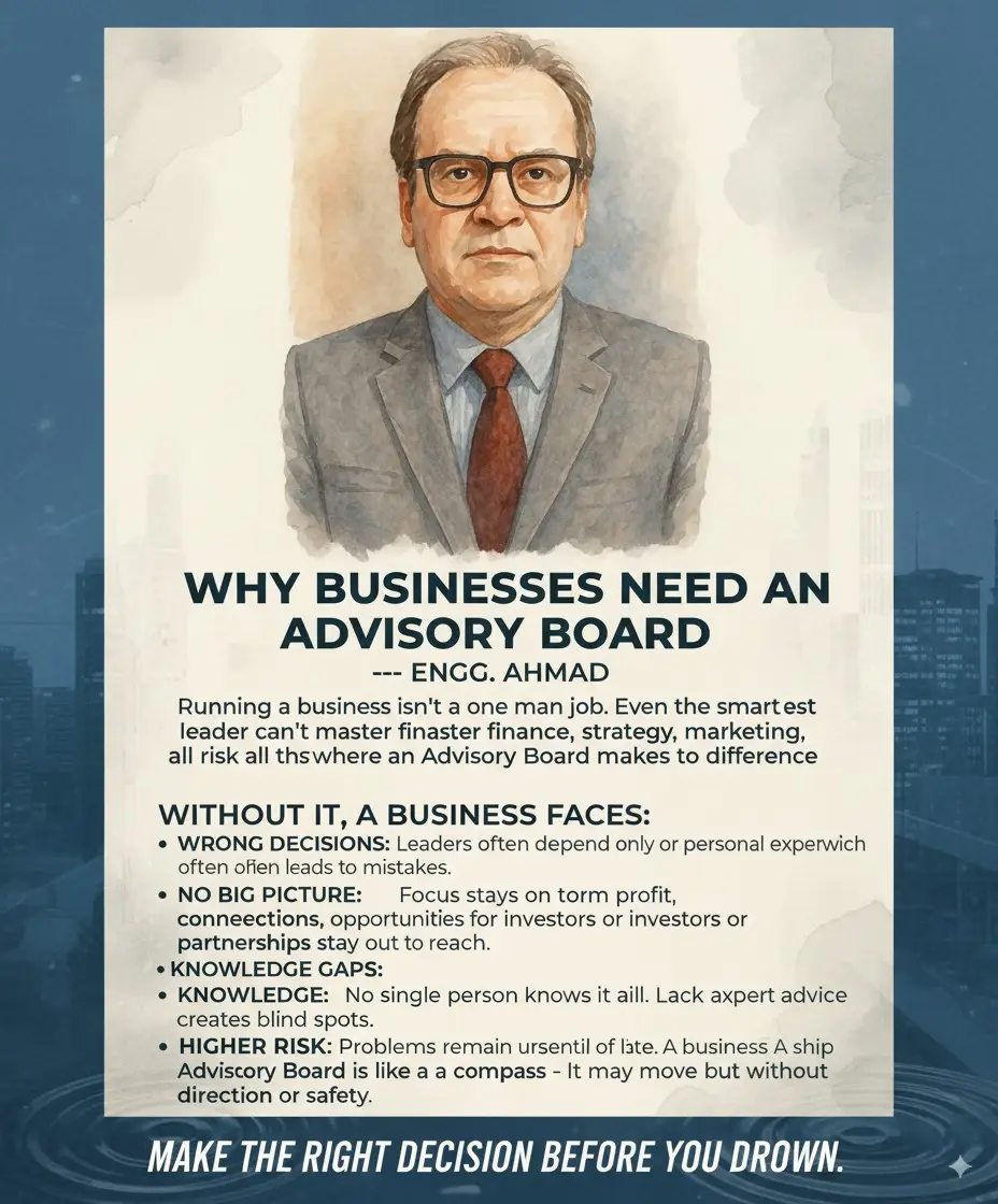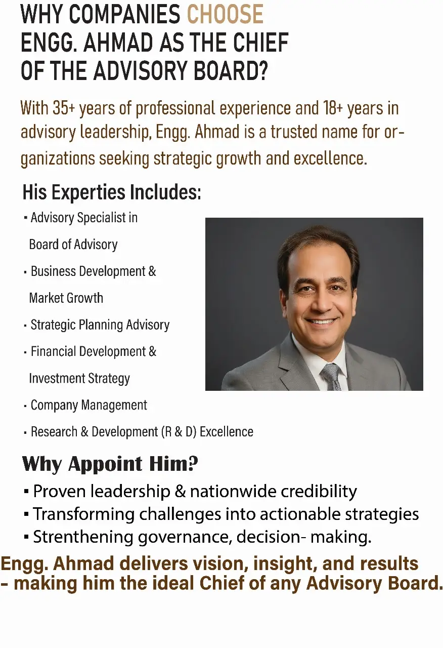 Engg. Ahmad has carved a legacy with over 35 years of distinguished experience, including 18 years specializing in Board of Advisory.