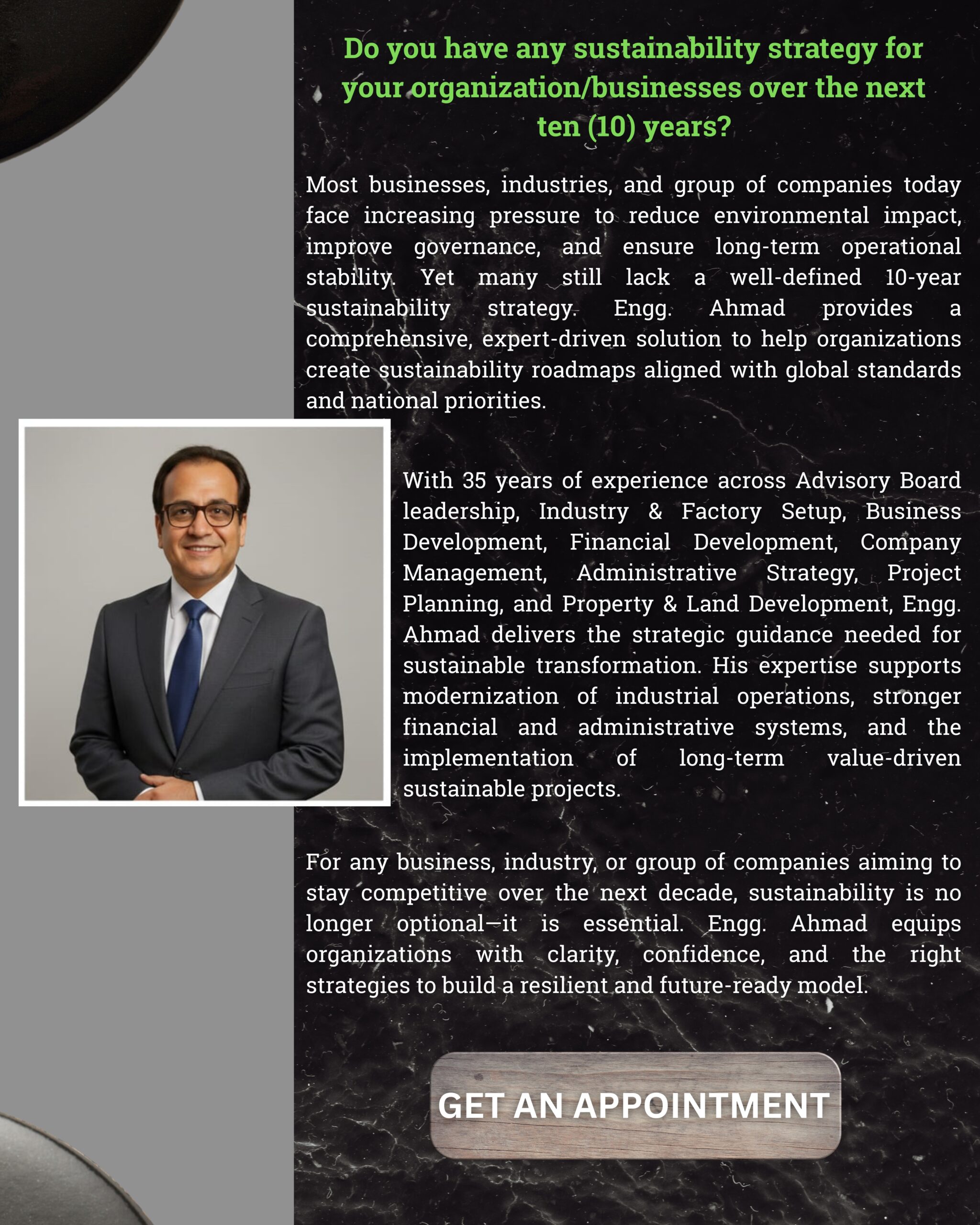 Engineer Ahmad is a highly prominent Advisory Specialist who stands as a beacon of wisdom, foresight, and integrity in the realm of advisory. With over 35 years of distinguished experience, including 18 years specializing in Board of Advisory. Engg. Ahmad has carved a legacy that transcends industries and borders. Expertise in Advisory Board – his pivotal role in shaping industrial establishments, business development, financial development, and Company Management is unrivaled. For more than three decades, he has not only guided organizations but also nurtured leaders, shaping visions into realities with unmatched clarity and conviction. Specializing in the Board of Advisory, he has earned a reputation as a trusted counselor whose words carry the weight of experience and the light of foresight. His unique ability to merge technical knowledge with strategic insight has made him a cornerstone in boardrooms, financial institutions, and industries alike. Renowned both at home and abroad, he has built a solid reputation as a trusted advisor to numerous organizations and navigated the complexities. Engg. Ahmad embodies the qualities of a true advisor—steadfast, discerning, and profoundly committed to the success of those he serves. His strategic insights Assist in developing business strategies, operational plans, and risk management strategies. Of the corporate landscape, Engg. Ahmad is currently engaged on a contract basis with leading domestic and foreign banks, group of companies, and industrial organizations. His career is not merely measured by years but by the enduring impact he has left on organizations, group of companies, and financial organizations that continue to flourish under his guidance.